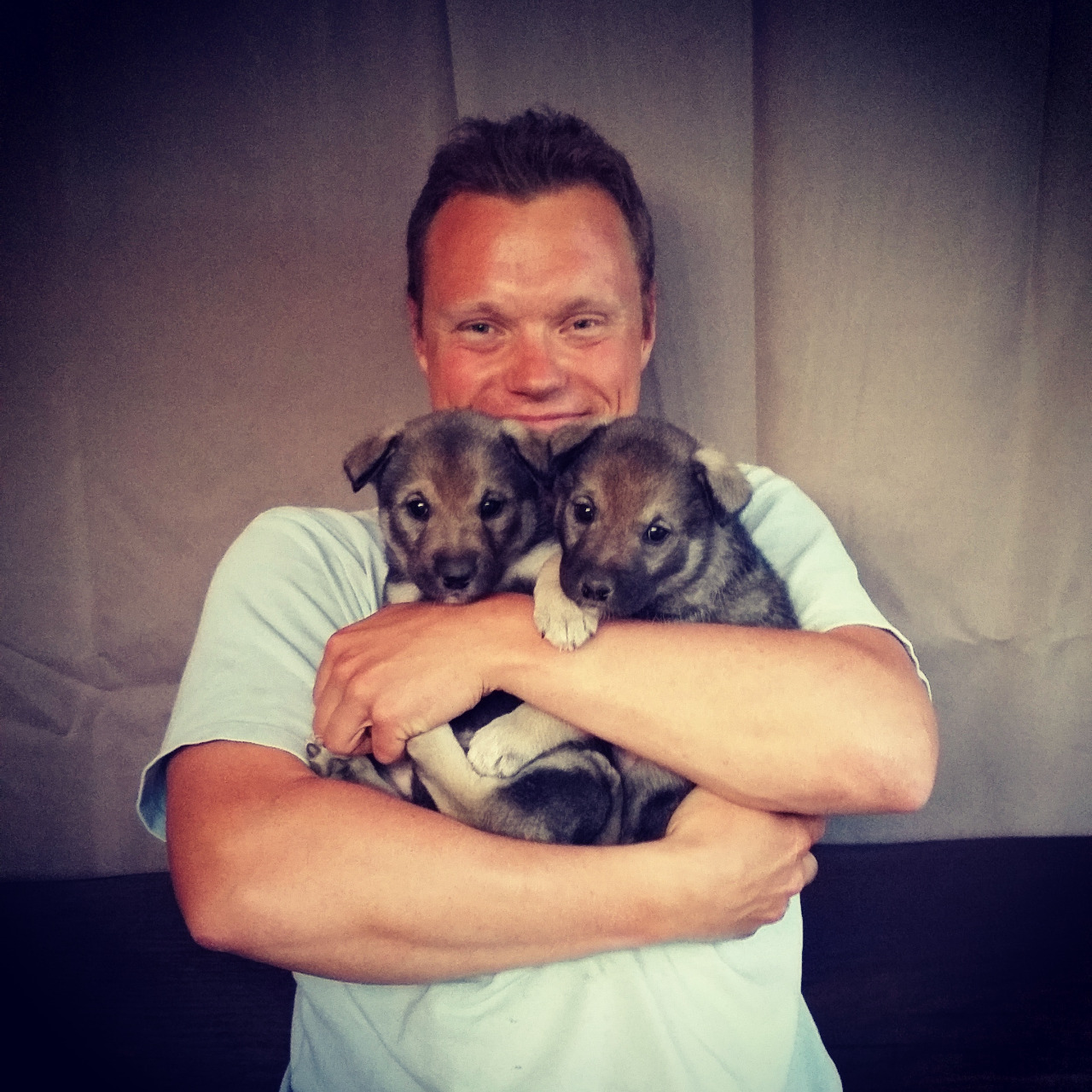 Bilde: Jonas og 2 av valpene. Her er de 5 uker gamle.